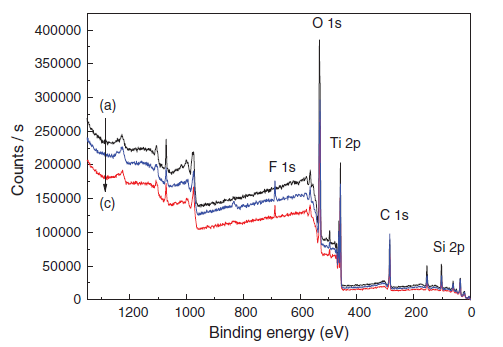 图4 活化的TiO2纳米粒子的XPS整体扫描:(a)TiO2-0,(b)TiO2-2和(c)TiO2-4