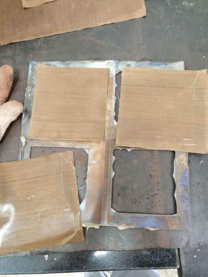 求助:在用尼龙6压片时出现凹坑,而且尼龙6从模具中拿下来的时候会出现开裂现象。模具上下垫的是一整块高温布,在把高温布裁成四小块时,凹坑少一些,但是开裂现象依旧存在。压片工艺:240℃预热十分钟,15MPa保压10分钟,期间多次排气。15MPa冷压120秒。
