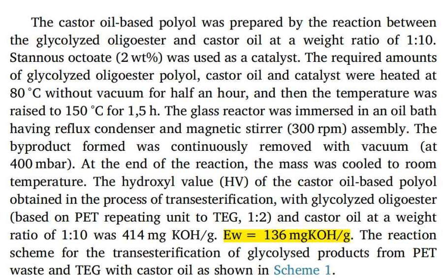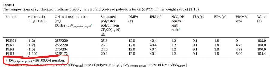 请问关于聚氨酯相关文献里面,出现里一个聚酯多元醇会出现一个EWpolyester polyol或者EW的值,请问各位大佬们这个是什么意思? 发自小木虫Android客户端 |