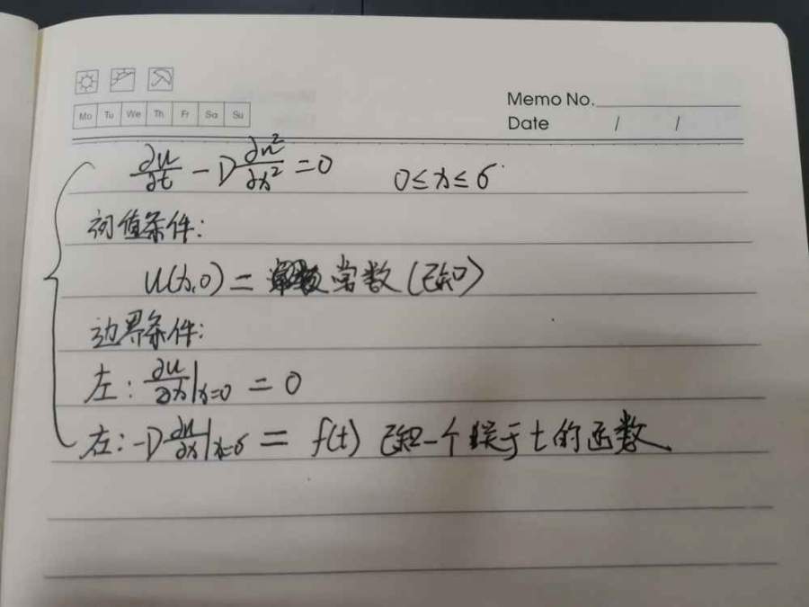 各位虫友,最近在研究材料的扩散系数,根据实验条件建立了这样的一个物理模型,边值条件是给定边界处的浓度梯度,f(t)已知,想通过实验的办法求的材料的扩散系数D,看文献都是先得到这样的偏微分方程的解析解u(x,t),然后将材料不同深度的物质浓度与u拟合,求的D。我现在不知道所建立的这样一个物理模型能不能求的解析解,也不会求解析解,跪求帮助。 发自小木虫Android客户端 |