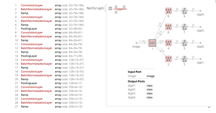有了数据集后我们需要在mathematica里导入数据集并进行相应处理,首先将60000数据集55200训练集和4800测试集,为了方便没有引入验证集,并将这些数据按找数据和标签一一对应,这里采用的方法是分别识别一张图片的四个字符,但是为了简化过程没有对图片进行分割,这将会极大的影响识别的效果。同时值得注意的是在mathematica里同时导入所有数据将占用很大的内存空间。我们需要利用File函数来制作生成器函数,这样可以极大的节约资源。我们处理好的数据集如下图所示。