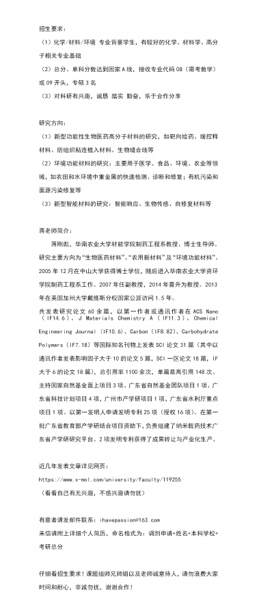 调剂要求: (1)化学/材料/环境 专业背景学生,有较好的化学、材料学、高分子相关专业基础 (2)总分、单科分数达到国家A线,接收专业代码08(需考数学)或09开头,专硕3名 (3)对科研有兴趣,诚恳 踏实 勤奋,乐于合作分享 蒋老师简介及近几年发表文章详见网页: https://www.x-mol.com/university/faculty/119255 (看看自己有无兴趣,不感兴趣请勿扰) 有意者请发邮件联系:ihavepassion@163.com 来信请附上详细个人简历,命名格式为:调剂申请+姓名+本科学校+考研总分 仔细看招生要求!课题组师兄师姐以及老师诚意待人,请勿浪费大家时间和耐心,非诚勿扰,谢谢合作! 文字文稿1.png |
