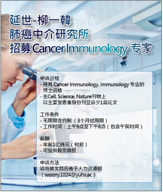 延世-柳一韓 肺癌中介研究所 招募 Cancer Immunology 专家 申请资格: -持有 Cancer Immunology, Immunology 专业的 博士资格 -在Cell, Science, Nature刊物上 以主要发表者身份刊登最少1篇论文 工作条件: 无限期合约制 (3个月试用期) 工作时间:上午9点至下午6点(包含午餐时间) 薪酬: 年薪1亿韩元(税前) 提供午餐,可提供股票期权 根据成果可提供创业资助 申请方法: 请将英文简历寄于人力资源部(woony1024@yuhs.ac) 微信:angelsarahki 发自小木虫IOS客户端 |