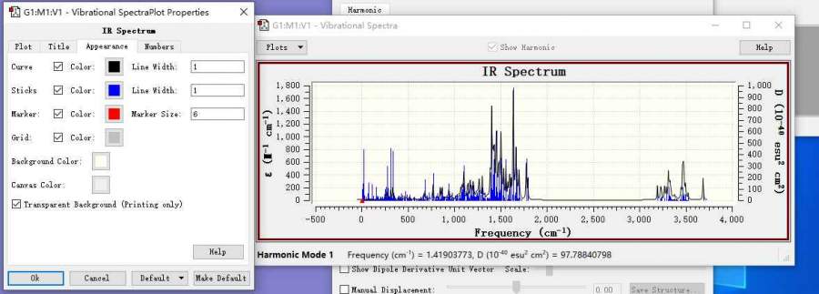 就如同图例所说,黑色的代表了曲线(Curve)指的就是模拟出的光谱。纵坐标看左边,光谱曲线的纵坐标是摩尔吸光度,(而摩尔吸光度又可以用朗伯比尔定律定律跟实验光谱里的吸光度联系上 A=epsilon*c*L)。 这个摩尔吸光度是根据计算得到的 IR intensity (单位是KM/mol,, 即 千米每摩尔 ),用洛伦兹函数对频率展宽得来单位是 L mol-1 cm-1 而蓝色竖线代表了这个分子每一个振动模式的强度和它们所在的振动频率,也就是图上那些蓝色竖线的高度和各自的横坐标。纵坐标看右边,竖线对应着每个振动模式的 Dipole strength ,它是根据每个振动模式的IR intensity 和 频率计算出来。 换算关系式 : IR intensity (KM/mol)=0.0002507 * Dipole strength (esu^2 cm^2 10^40) * 振动频率(cm-1) |