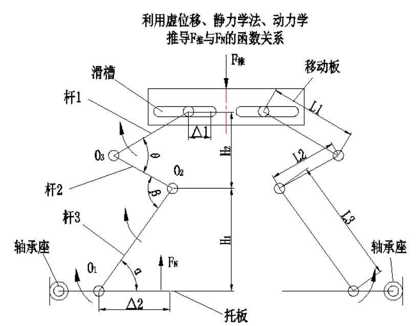 本人理论力学学的不好,诚恳希望有大神指点下,谢谢! 这是一种托板承重机构,取左侧为研究对象,有一推力推动移动板后,移动板向下运动,带动杆1旋转的同时,在滑槽内,向着左侧移动一段距离,杆1的旋转给杆2一个压力、一个转矩,杆2也做旋转运动,并将力矩传递给杆3,杆3带着托板向上运动,杆3上放一个重物,受到压力FN,杆3的最左侧还有一个固定的轴承座当移动板向上运动的话,则杆3带着托板向下运动,原理同上图中已将高度、杆长、杆1和托板的行程、各个杆的转动角度、高度,都已标注图上,求大神,能给出 虚位移法、静力学法和拉格朗日动力学法进行求解!! 推导推力与弹力机构示意图.JPG@ctgu_zheng@kerven |