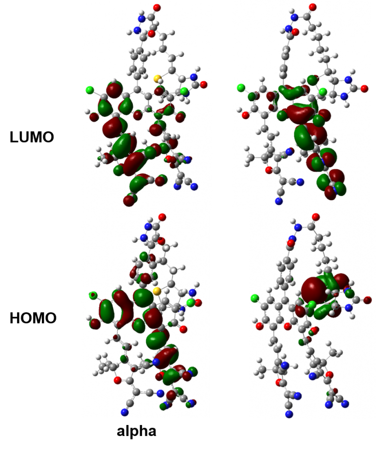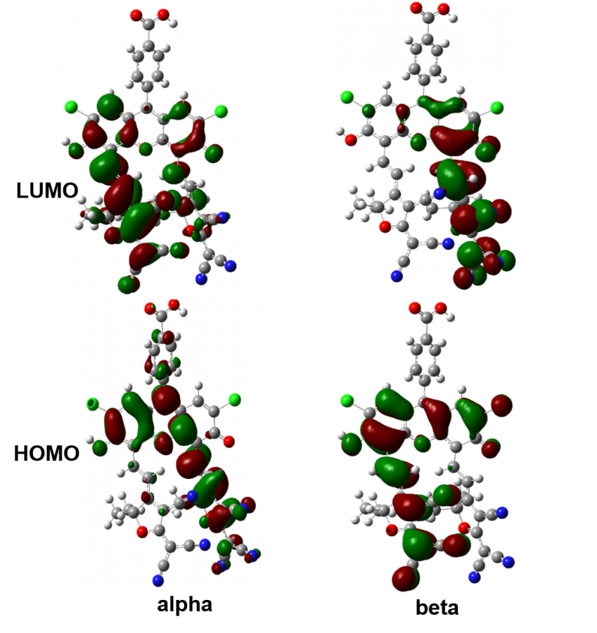 对Alpha和beta分别进行cube,得到图2和图3,为何会出现完全不同的两个HOMO?另一个对比分子2,对Alpha和beta分别进行cube,得到图4,分子2 的alpha和beta的HOMO和LUMO发生了左右位置的变动,这是因为什么。同时我想知道分子1的beta HOMO,能否说明分子1比分子2 的电子密度大,更容易失去电子(本人的胡乱猜测)?或者有更合理的解释。对理论计算不怎么了解,恳请解释的通俗一些,万分感谢!