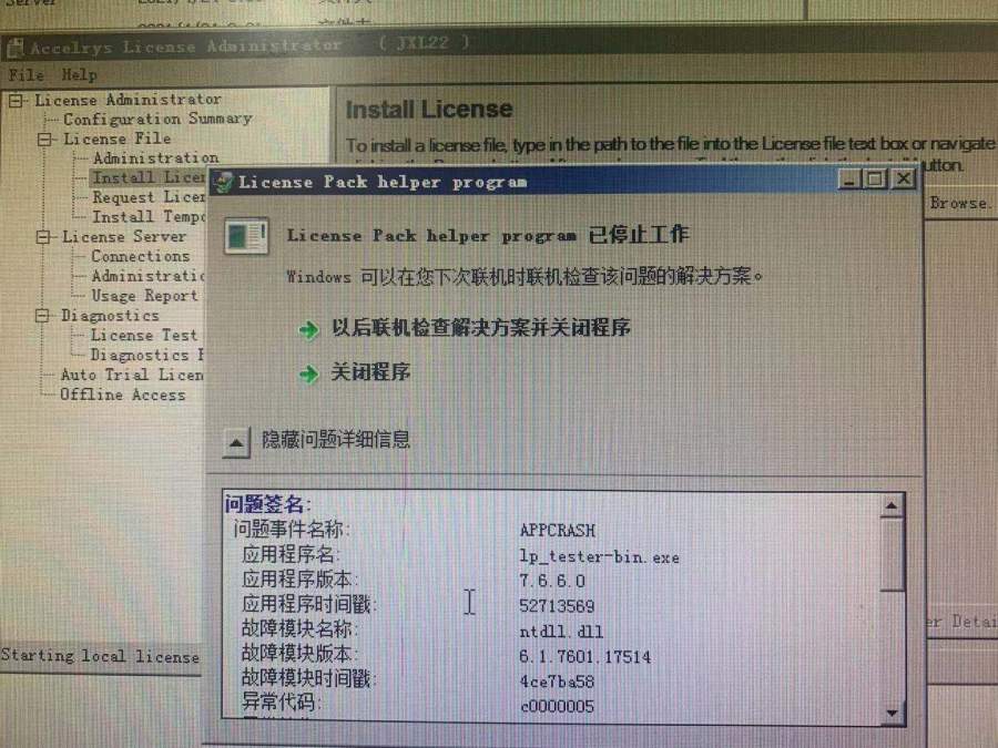 MS7.0,已经用管理员身份安装好MS主软件和 LicensePack 中的 lp_setup.exe。将lic文件第一行修改为计算机名称,复制到C盘Accelrys中后,接下来进行 Install License 时出现以下报错,求大神解答。 微信图片_20210424092202.jpg |