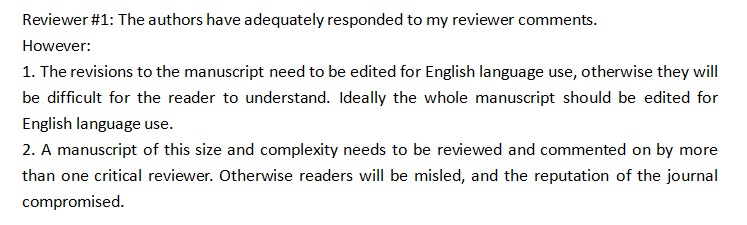 各位虫友们,求教:我投了一篇综述,一审就一个审稿人,给了三十条意见,编辑让小修。修回后还是那个审稿人给了2条意见,编辑也是让小修,感觉这两条意见不太友好 第1条是修改语法,第2条是说审稿人太少,会给读者带来误导,期刊名誉受损。这种情况修回还能接收吗,该怎么回复呢?图片是二审意见。 没有遇到这种情况。微信图片_20210428094806.png |