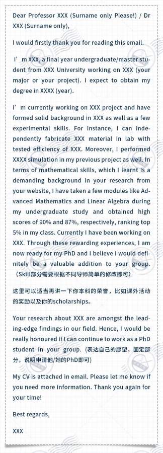提示:文章皆为原创。 我已加入“维权骑士”的版权保护计划,版权所有,未经作者允许禁止转载,违者必究。 今天跟大家分享和总结一下不同类型的套磁以及申请过程中容易出现的问题。 首先做一下科普:套磁只对于研究型硕士(MRes/MPhil)及博士(PhD/DPhil)有效。 申请季的早期有效套磁有助于:获取online/FTF面试机会、帮助修改RP、帮助定位课题、帮申奖学金、给与口头offer等。 非申请季的早期有效套磁有助于:获取课题组实习机会、获取推荐信、长期维持关系等。 作为申请研究类学位过程中一项重要的流程,在这个过程中我们不是简单的通过文书和申请端口,而是直接通过邮件跟未来的导师沟通,因此对于申请结果有非常直接的影响。 需要注意的是,直接面对导师既有可能充分展现自己的优点,同样有可能暴露自己的缺点,如何完成一篇高质量的套磁邮件绝对是重中之重。 尽管套路千千万,但是归根结底大部分的套磁类型可以分成以下两种: 学术套: 申请PhD回复率大概是最高的一种套磁方法。 学术套的核心就是通过学术互动自我介绍,大家最常用到的“小伎俩”就是找到教授的paper,读一读然后发邮件问个问题,最后引出重点——老师我想读你的PhD。 比如之前遇到一名同学就在上海交大硕士就读期间与匹配到的牛剑学长学姐的配合,通过前期的套磁准备,以“课题组”方式进行了全方位的头脑风暴进行了信息挖掘,成功通过学术套磁收获到了Oxford-Chemistry Department的课题组合作项目,直接确定了未来录取的方向,并在合作期间收获了SCI一篇。 常见的学术套直接反应在邮件主题上: ◆ Question regarding your paper about XXX ◆ Question from perspective PhD candidate about XXX 简单明了,切中主题。邮件主体可以如下例类似,也可以自己组织,但是邮件一定要包括:你的自我简介;你的问题;明确你的读博动机。 第三部分不要忘,以免让你的导师真的以为你在问他问题。(因为论文作者确实经常收到邮件被询问论文里的一些问题!) 学术套的回复率比较高一方面可以理解为教授要对自己的文章负责,第二个是教授看到了你套他的时间成本,所以认为你不是在当海王,出于互相尊重进行回复。 但是,学术套的缺点就是既要技术也要时间。学术套既有可能展现你的学术素养,也有可能暴露你的学术素养。 如果你问的问题导师默认为是非常基础层面就应该了解的,或者是文章里已经有回答的,那这个学术套就是典型的偷鸡不成蚀把米。 所以这个学术套一般只适用于本专业申请PhD,对于跨专业或者跨领域申请的同学请慎重使用。 半模版类套磁: 顾名思义,部分内容,尤其是自我介绍的内容可以固定,比如你在展现自己的科研能力的部分说了你目前在做什么project,或者你的本科GPA大概多高拿到了什么奖学金。这一部分是可以用模板,提前调校好语言。 但是有一部分还是需要根据套磁的老师进行调整:你的能力和老师目前工作的重叠在哪里,借此表达你了解组内的工作方向以及你长久以来对申请他PhD的兴趣。 简单一点的重叠可以是,拥有试验/数值模拟/编程的技能。 比较specific一点的重叠更好,比如说目前组内试验用到的某种试验操作/仪器你之前已经掌握,或者你之前有制备类似sample的经历等等,这些都是比较具体的重叠。 比如以下就是一个比较classical的半模版类的套磁: 半模版类套磁适合比较大规模的套磁,更需要结合我在上一期中说到的list配合使用。在合理的策略下,半模版类套磁也可以收获满满。 比如之前遇到过的例子:一个同学正在读研一,但是通过相应的规划和帮助,在5月份即完成硬件准备,开始了套磁。 由于同学的目标明确,套磁工作展开合理,该同学很快锁定了几位背景匹配且录取意向积极的导师,并通过套磁获得2次参与线上课题的机会和1次北美暑期线上课题的参与机会,还被提名参加了Upenn暑期夏令营,并在申请季直接收获了曾套磁过的committee的分配导师和口头offer。 无论是哪种套磁方法,都应注意语言措辞的准确/严谨,对于部分的文史政类等对英语有较强要求的专业,还应当注意语言的本土化。 另外正式的套磁整体时间应掌握在4月底到11月之间,可视情况适当提前,但是不建议推后。过早很可能教授不确定第二年是否招人或是否有funding,过晚有可能没位置。 当然,对于部分同学,如果你的硬件背景,包括GPA/publication已经定型,或者有意向申请暑研/RA等position提前进组工作,那套磁时间建议提前至4月甚至更早为宜。 最后作为一名过来人,我想跟大家强调的最后一点就是,套磁不仅仅需要技术,还需要一颗强大的心脏。很多小伙伴发出套磁邮件一天没有收到回复就沉不住气,觉得即将成为失学儿童,这大可不必。 如果长时间教授没有回复,可以根据你的excel,在适当时间发一封gentle的提醒邮件。因为教授没有回复你可能真的不是因为他没看中你,只是他的邮箱太满遗漏了而已。 当然对于提醒邮件的时间和尺度的把握,又是一门具体的微操课程,这里不单独细说。 最后祝愿小伙伴们都能如愿以偿收到自己心仪的offer。 |