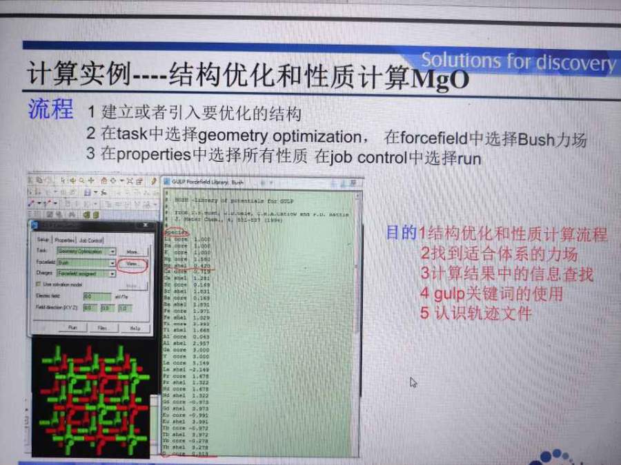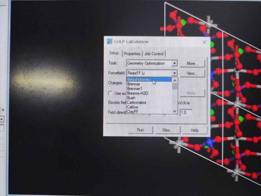 我现在做本科毕设,要做的是LiVOPO4的性质计算,现在卡到了结构优化了,求大佬教教应该选择哪个力场,图一是我看的gulp使用教程,图二是我现在遇到的问题,不知道选哪个力场