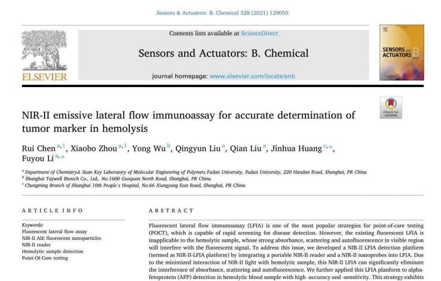 今天分享一篇发表在Sensors and Actuators B: Chemical(2020年IF=7.1)上的文章,名为《NIR-II emissive lateral flow immunoassay for accurate determination of tumor marker in hemolysis》[1]( NIR-II放射侧流免疫分析法用于准确测定溶血样本中肿瘤标志物)。 癌症是全世界范围内一个重大公共健康问题,尤其给贫困国家和发展中国家造成严重负担。由于人口增长和老龄化,癌症死亡率逐年上升,在欠发达国家尤其严重。目前,临床肿瘤标志物的检测主要是通过化学发光平台,但依赖昂贵的设备和试剂,不适合定点检测(POCT)。因此,癌症诊断迫切需求一种更经济实惠、方便、快速、灵敏的诊断工具。 侧向层析检测(Lateral flow assay, LFIA),又称条带检测,是一种便携、快速的诊断方法,不需要昂贵的设备就可以检测液体样本中的目标分子。侧向流动测试条通常由四部分组成:聚氯乙烯基材、样品垫、包含试验线(T线)和控制线(C线)的硝化棉(NC)膜和吸水垫。LFIA已广泛应用于医学诊断,具有较高的灵敏度,如家用妊娠试纸。近年来,荧光LFIA因其灵敏度高而备受关注。然而,现有的荧光LFIA大多只能检测尿液、血浆等吸收和散射较弱的样品。传统荧光LFIA中使用的荧光探针的激发和发射波长通常在可见范围,容易被许多生物样本吸收和散射,如全血。特别是在溶血样本中,红细胞破裂后释放的血红蛋白不能从血浆中分离出来(通常用于全血提取血细胞和血浆),对可见荧光检测有很强的干扰。因此,对于溶血样本,即使是溶血血浆,也不可能进行常规荧光LFIA检测。溶血概率高(采集时可达10-31%),且溶血的发生难以消除,因此建立直接检测溶血样品中目标物的LFIA方法至关重要。 本研究开发了一个快速、高精度、高灵敏度的分析平台,将便携式NIR-II读取器和NIR-II纳米探针(将其命名为“BBTD@PS”)集成到LFIA中。由300 nm羧基聚苯乙烯纳米颗粒(PS)和NIR-II AIE dye of 4,8-Bis[4-(N, N-bis(4octyloxyphenyl)am-ino)phenyl]-benzo[1,2- c:4,5c′]bis([1,2,5]thiadia-zole) (BBTD)组成,在680 nm氙灯激发下可发射960nm的荧光峰值。与可见光(400 ~ 650 nm)相比,血液样本与NIR-II光的相互作用最小,可以显著提高信噪比(通过减少散射、吸收和自荧光)。且BBTD@PS具有优良的光稳定性和长期贮存稳定性。同时,使用自制的NIR-II读取器采集荧光信号,这是迄今为止NIR-II窗口标记侧向流动测试条的首次展示。我们开发的分析平台(NIR-II-LFIA平台)能够准确测定溶血样品中AFP的浓度。NIR-II-LFIA平台消除了信号采集过程中样品矩阵引起的偏差,对溶血样品定量检测的实现具有重要意义。 实验过程: 一、材料 十水四硼酸钠、硼酸、十二烷基硫酸钠(SDS)、乳剂B66 (B66)、Tween 20和四氢呋喃(THF)购自 J&K Scientific LTD。 N-(3-Dimethylaminopropyl)-N'- ethylcarbodiimide hydrochloride (EDC), N-Hydroxysulfosuccinimide sodium salt (sulfo-NHS) and bovine serum albumin (BSA)购自Sigma-Aldrich。PVC基、样品垫、硝化棉(NC)膜、吸收垫、AFP校准器、AFP抗原、AFP抗体、人血清白蛋白(HSA)、视黄醇结合蛋白(RBP)抗原、C反应蛋白(CRP)抗原、胱氨酸抑制素C (CYC)抗原、降钙素原(PCT)抗原、血清淀粉样蛋白A (SAA)抗原购自上海捷门生物技术有限公司。所有的化学品都是分析级的,不需要进一步提纯。 二、表征方法 用日本岛津3000分光光度计记录BBTD与全血的紫外-可见-近红外吸收光谱。用680 nm氙气灯在QuantaMasterTM40上记录了BBTD和荧光纳米颗粒的近红外发射光谱。1H NMR和13C NMR在Bruker AV-400谱仪上进行了表征。用Zeiss Ultra 55场发射扫描电子显微镜(FE-SEM)记录了制备的纳米颗粒的形貌。采用Nano-ZS90 Zeta Sizer对纳米颗粒的动态光散射(DLS)和Zeta电位进行了表征。单分散的纳米探针数据通过Flow NanoAnalyzer (NanoFCM Inc.)表征。在680nm LED灯的激发下,用CMOS相机采集侧向流动测试条的图像。所有实验条件均在室温下进行。 三、 合成BBTD@PS NIR-II AIE荧光团(BBTD)和单分散PS的制备方法均参照以往报道的方法。BBTD通过膨胀法加载于PS (BBTD@PS)中。一般方法是先用500 μL SDS水溶液稀释PS (250 μL, 40 mg/mL)的水悬液,再加入THF (200 μL)。紧接着,加入10 μL THF中的BBTD染料溶液(20 mg/mL)。搅拌数小时后,将含BBTD的膨胀珠快速离心分离,用水洗涤三次,然后放入2ml超纯水中保存。 四、 BBTD@PS偶联捕获抗体(BBTD@PS@Ab) 根据先前描述的方案,捕获抗体共价固定在BBTD@PS上,并进行了一些优化。将捕获抗体修饰到BBTD@PS表面的典型步骤如下:用1ml BBS缓冲液(0.01 M BBS, pH7.4)洗涤100 μL BBTD@PS悬液(约含2mg干PS)。将BBTD@PS置于含200 μg EDC和112 μg磺酰nhs的0.50 mL BBS缓冲液中,室温激活1 h。之后,获得的复合物被离心分离去除多余化学试剂,然后在0.50ml的包含0.20mg捕获抗体的BBS缓冲液中室温孵育3 h。然后,复合物在BSA溶液(10mg/ml)中室温封闭1 h。孵育后,BBTD@PS@Ab用1mlBBS缓冲液(0.1 M BBS, pH7.40)清洗,并在4度条件下存放在1ml BBS缓冲液(含1% BSA和0.05% proclin300)中。 五、 侧向流动试验条的制作 侧向流动测试条由四部分组成:PVC基材、样品垫、NC膜和吸收垫。用喷雾器将BBTD@PS@Ab (16.70 mg/mL)以1.20 μL/ cm的速度滴在样品垫板上,然后在37度下过夜干燥。用喷雾装置以1 μL/cm的速度分别喷施检测抗体(2 mg/mL)和兔抗鼠IgG (1.80 mg/mL),室温干燥过夜。最后,用切纸机将组装好的带材切成3.80毫米的单横向流带材,并放入塑料卡片中。 六、用预制的侧向流动测试条进行测定 用全血稀释抗原原液制备AFP全血标本(0、0.80、8、80、400、800、3200、5700 ng/mL)。将AFP加标10 