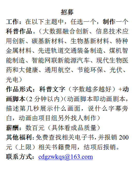 一个科普项目,招聘专业人士辅导或直接撰写科普文本