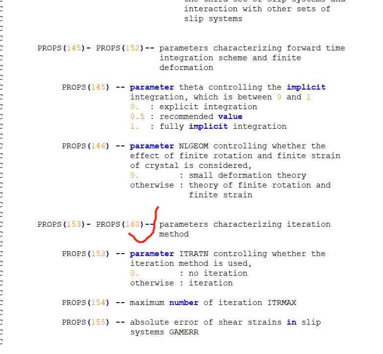 原始的umat是要读160个参量的,或者有些参量直接在for文件中进行定义,这样就不需要这么多参量了,你可以看一下.for文件,找一下程序里面都读取了哪些参量props(**) 发自小木虫Android客户端 |