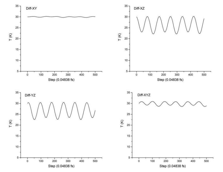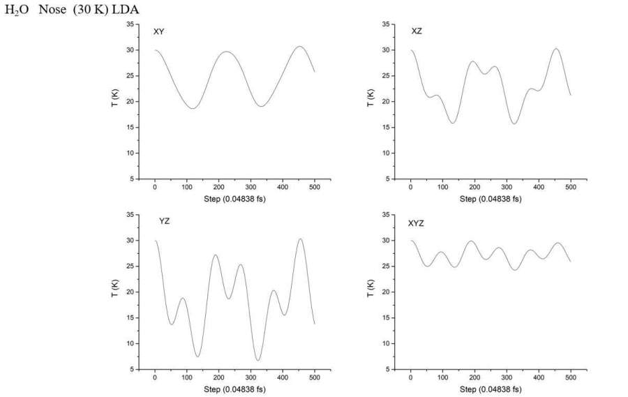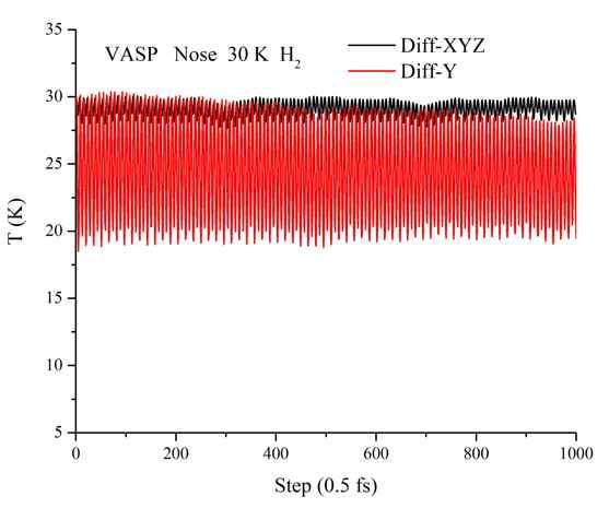 在10x10x10的盒子里,做单个H2分子动力学模拟,目标温度为30k。在input.fdf文件里只改变了H2的坐标(键长不变,仅仅旋转一定角度),控温效果却完全不同: 两个氢原子沿着y方向,温度在8到31 k范围内波动;旋转为沿着z方向,温度在28到31 k范围内波动。我用了不同的热浴方法,结果差不多。单个水分子也存在这种情况。有哪位大佬知道是什么原因? 发自小木虫Android客户端 |