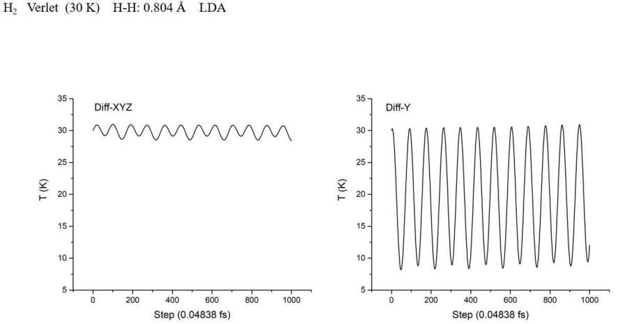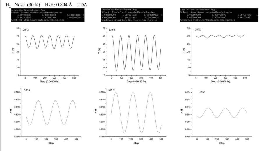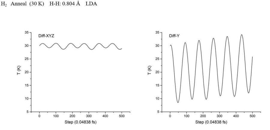 Siesta 分子动力学模拟,10x10x10的盒子里将氢分子旋转90度,控温效果为什么会不同?