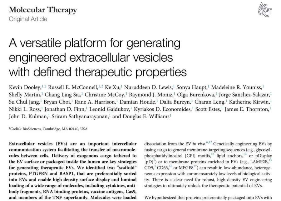 今天分享一篇发表在Molecular Therapy(2020年IF=8.986)上的文章,名为《A versatile platform for generating engineered extracellular vesicles with defined therapeutic properties》[1]( 一个用于产生具有明确治疗特性的工程细胞外囊泡的多功能平台)。该文是美国Codiak BioSciences公司发表的研究成果。