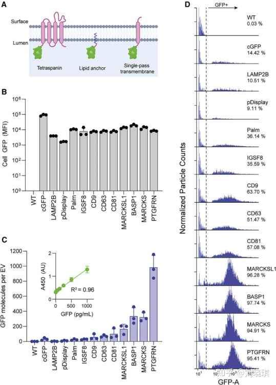 GFP融合蛋白被包装进EVs的效率是通过比较细胞内和EVs中GFP水平来确定的。虽然通过流式检测,大多数靶向构建物的细胞GFP表达相似,但通过ELISA定量检测,EVs相关的GFP表达有广泛差异,其中MARCKSL1、BASP1、MARCKS和PTGFRN在EV中GFP表达水平最高。尽管非靶向细胞质GFP (cGFP)在细胞中的表达量是其他结构的10倍,但它仅在EV中表现出较弱的定位,这表明GFP在细胞中的丰富表达不足以被随机包装到EV中。