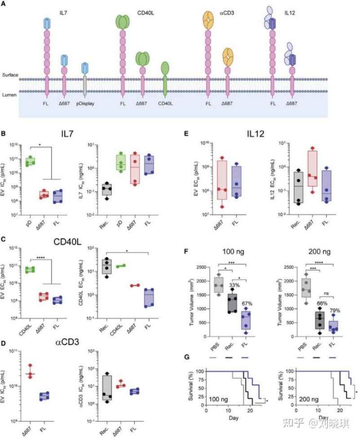 IL-12是由抗原呈递细胞(APCs)自然产生的,作为一种稳定相关的异二聚体,并通过刺激肿瘤微环境(TME)中的免疫细胞分泌干扰素γ (IFNg)来提供抗肿瘤免疫。我们构建了一个将PTGFRN融合到由p35和p40的亚基由一个柔性的连接器连接组成的单链版本的人IL-12。与FL或D687 PTGFRN融合的结果与IFN在外周血单个核细胞有相似效能(PBMCs;EC50= 4.23E+8 [FL] vs 6.70E+8 [Δ687] p/mL)。当归一化到IL-12浓度时,IL-12-FL EVs和重组IL-12表现出相似的效价(EC50= 0.277 [FL] vs 0.269[Rec.] ng/mL),比D687-IL-12强6倍(EC50= 1.77 ng/mL)。虽然我们观察到供体与供体之间的显著差异,但在每个供体内部,治疗组之间的相对EC50值保持一致。这些IL-12构建物的小鼠模型也被建立,在100和200 ng剂量的重组小鼠IL-12或EV当量IL-12剂量下,在同基因B16F10黑色素瘤模型中评估了抗肿瘤活性。与重组IL-12相比,瘤内给予小鼠IL-12- FL EVs改善了肿瘤生长抑制和生存。