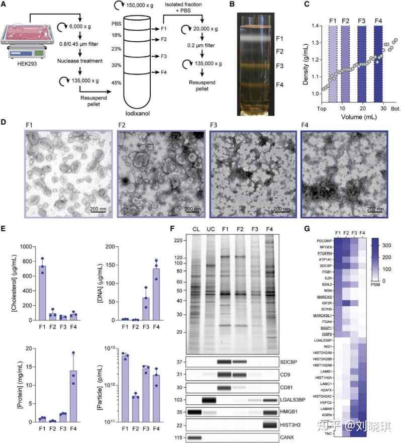 我们认为,通过对高度纯化的EVs进行详细的表征,可确定能作为EVs装载功能性分子的支架蛋白。为此,我们开发了一种从大量细胞培养上清中严格且可重复纯化EVs的方法。从适应悬液的HEK293细胞中提取的细胞培养基通过连续的过滤和离心步骤处理,通过iodixanol梯度纯化得到粗EV颗粒。我们将这个梯度分成四个组分(F1-F4),收集迁移到相邻密度层之间的组分,并使用超微结构和生化技术分析这些组分是否存在EVs。