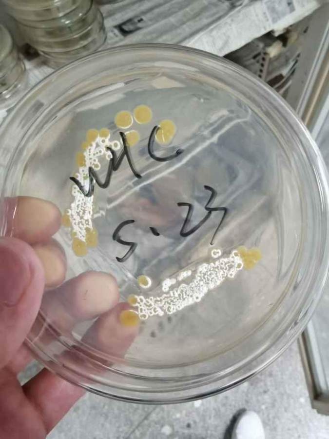 想问一下,楼主有这个菌的菌落正确形态的资料或者经验么?还是第一次接触这个菌,尝试划线分离的?你怀疑这个菌落形态是那些地方感觉不正常呢? 单从你的平板上看,所有的菌落形态颜色都是一致的,应该是属于同一种菌,不是多种菌污染混合的。 另外链霉菌属很多菌在适宜的环境和培养时间条件下,是会有菌丝产生,并且有的会产孢子(我们对链霉菌属进行保种的时候,基本上都是收集生长的孢子进行保种)。 所以推测平板上菌落密集的地方,有灰白色菌丝的生长可能就是这种链霉菌到达一定生长周期的正常现象。 楼主可以查询一下该菌的遗传形态学的资料,菌落颜色?是否光滑?是否易刮起?是否产菌丝产孢子?菌丝是什么颜色?等等,来给你的分离结果提供参考帮助,祝好! |