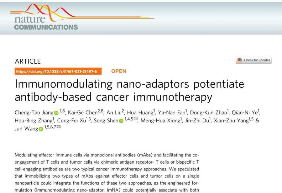 今天分享一篇发表在Nature Communications(2020年IF=12.121)上的文章,名为《Immunomodulating nano-adaptors potentiate antibody-based cancer immunotherapy》[1](免疫调节纳米适配器增强基于抗体的癌症免疫治疗)。