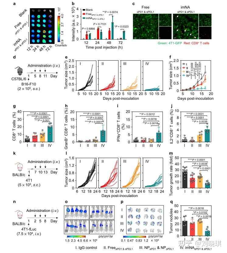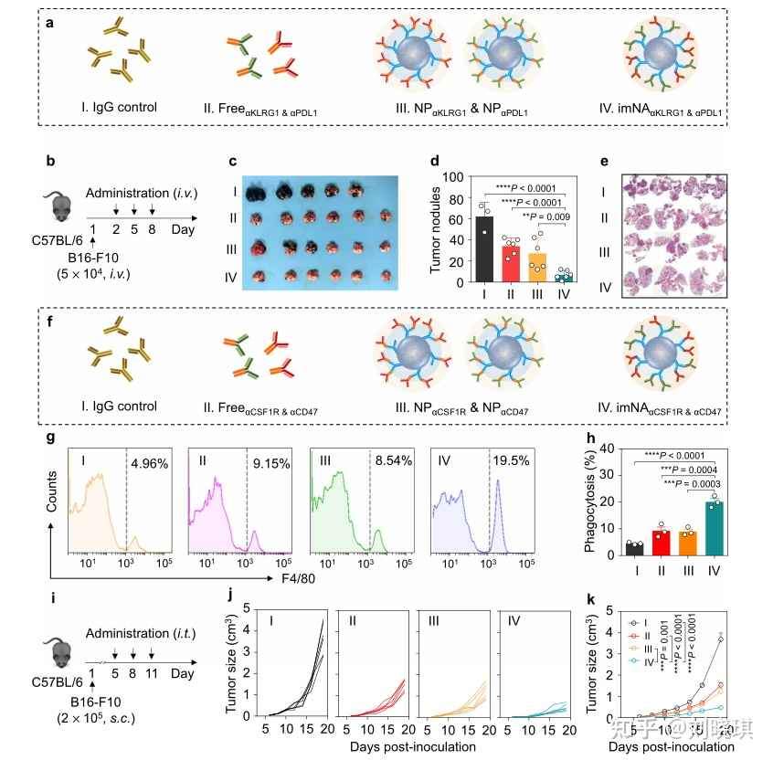 在皮下黑色素瘤模型中,将2.0×10^5个B16-F10细胞以100 μL PBS接种于6-8周龄雌性C57BL/6小鼠的右侧皮下。雌性BALB/c小鼠乳腺脂肪垫注射4T1细胞5.0 ×10^5个,建立原位乳腺肿瘤模型。当肿瘤体积约为50mm3时,将小鼠随机分为4组(每组6只或10只),按每3天注射一次,共注射3次,静脉或瘤内给药。对于imNAαPD1&αPDL1,αPD1和αPDL1的剂量为2.5 mg/kg,而对于imNAKLRG1&αPDL1和imNAαCSF1R&αCD47,αKLRG1、αPDL1、αCSFR1和αCD47的剂量为1.5 mg/kg。用卡尺测量肿瘤垂直直径监测肿瘤体积,根据以下公式计算估算体积:V=L×W2×1/2 (V,体积;L,长度;W:肿瘤宽度)。每三天监测一次体重。采用Kaplan-Meier生存分析表达生存率。