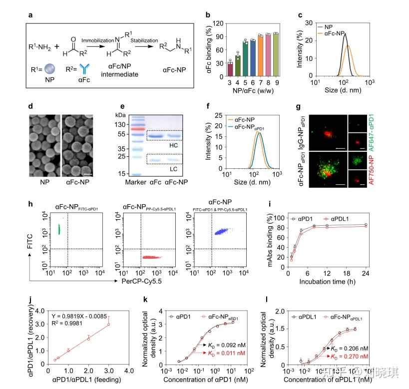 用100μL (5μg/mL) rmPD1或rmPDL1包被ELISA板(康宁),在37℃条件下2 h。然后在室温下用2% BSA(in PBST)中阻断1小时。加入一系列浓度的自由单抗(αPD1或αPDL1)或NP固定化单抗( αFc-NPαPD1/αFc-NPαPDL1),在室温下孵育1小时。通过PRISM软件(GraphPad)绘制归一化的吸光度值与αPD1/αPDL1浓度之间的关系,得到解离常数kd。