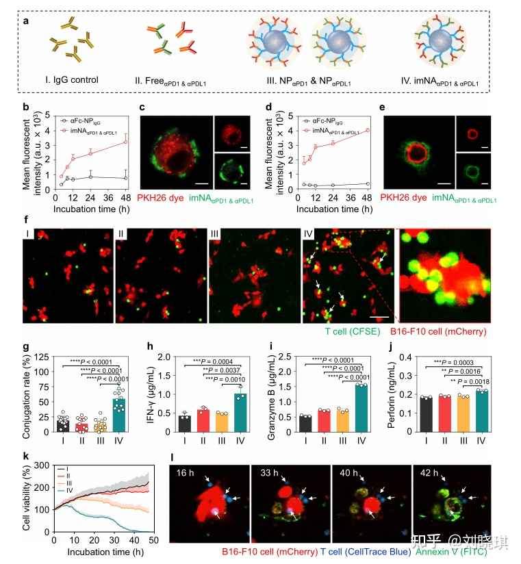 检测抗原特异性T细胞的细胞毒性,CD8+T细胞从OT-1转基因小鼠分离培养并用anti-CD3/28抗体(5μg / mL) 刺激24 h。然后CD8+T细胞和 Hoechst 33342 标记的B16-F10-OVA细胞以5:1或10:1的比例在100?L培养基(含 IgG control antibody (20 μg/mL), FreeαPD1 & αPDL1, N PαPD1 & N PαPDL1or imNAαPD1 & αPDL1)中共培养48h。共孵育后,上清液中和贴壁细胞的H33342用 Infinite? 200 PRO microplate plate reader进行检测,细胞活力用以下公式计算:细胞生存能力= (A - B) /A,A为H33342的总量,B是上清液中的H33342。
