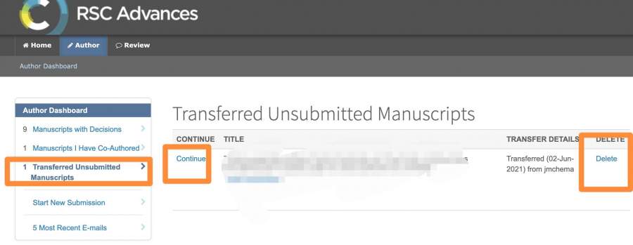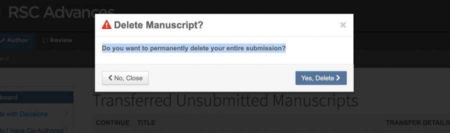 【急】大佬们,我投的JMCA界面找不到文章状态,只找到个“Manuscripts Awaiting Approval to Transfer”,我以为是需要同意才能进入审稿,就点了确认,这时才出现被拒的letter, 才知道这是同意转交给RSC advance了。。。然后我赶紧登陆RSC advance,在"Transferred Unsubmitted Manuscripts" (P1)里找到的我被转过来的文章, 点了后面的delete(P2),是不是就相当于撤回了??我是不是可以安心投别的杂志了?跪谢跪谢! 发自小木虫Android客户端 |