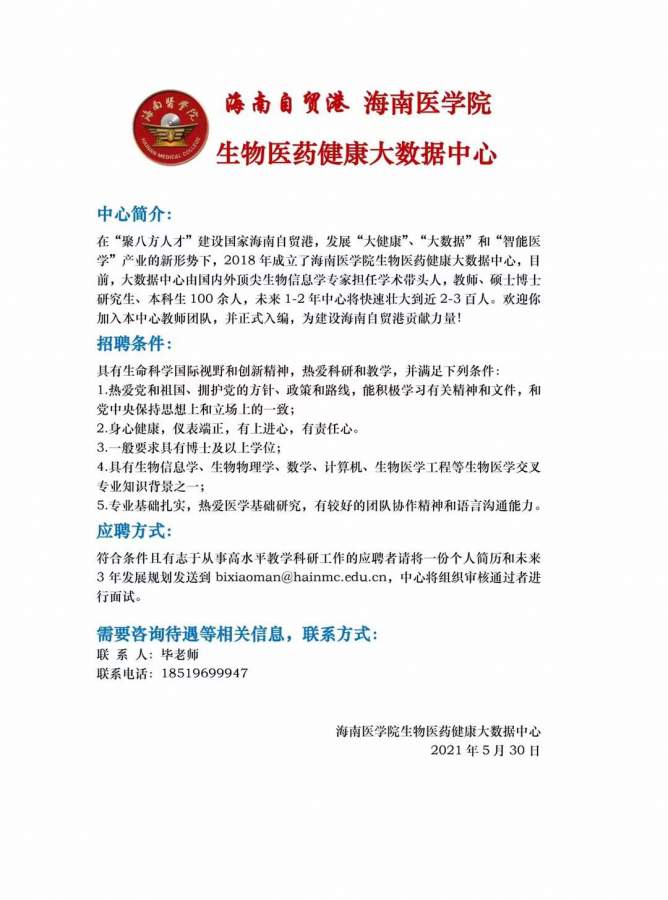 海南医学院生物医药健康大数据中心公开招聘啦!