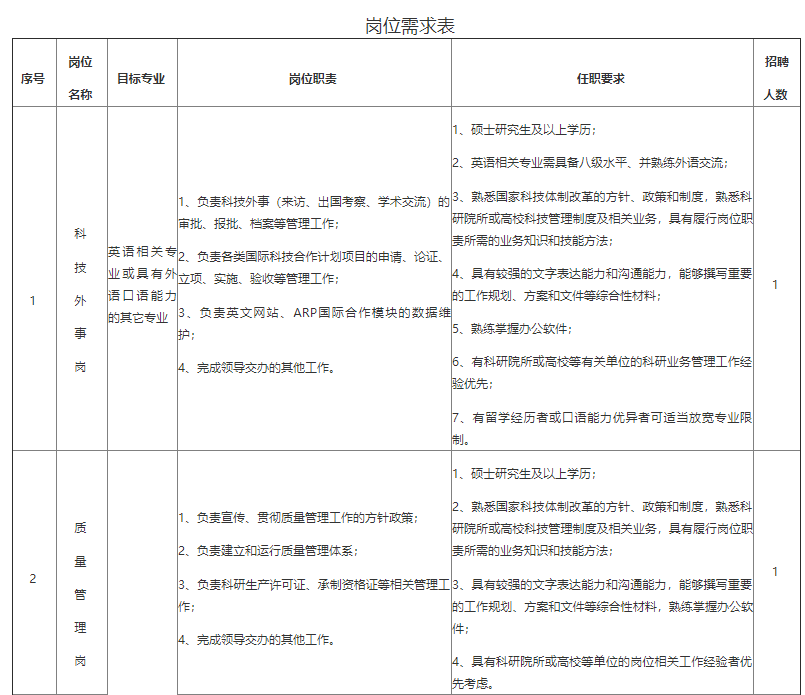 中国科学院赣江创新研究院2021年6月科学技术处招聘启事(https://www.gia.cas.cn/zpxx/202106/t20210609_6081599.html)转正后税前13-20万/年起。 中国科学院赣江创新研究院(以下简称“赣江创新研究院”)是由中国科学院与江西省人民政府共建的中国科学院直属科研机构,位于江西省赣州市。根据中国科学院“三个面向”“四个率先”的办院方针,围绕关键金属资源领域国家产业发展重大需求,开展基础性、战略性、前瞻性研究,构建全链条创新体系,建成集创新研究、人才培养、重大应用为一体的新型研发机构,实现关键金属资源产业绿色发展和高端应用方面的提升跨越,发挥国立科研机构的骨干与引领作用。 根据赣江创新研究院发展需要,现面向社会诚招以下管理类人才: 一、基本条件 1、热爱祖国,遵纪守法,品行端正,爱岗敬业; 2、具有较强的服务意识、团队合作精神和组织协调能力; 3、具备适应岗位需要的身体条件; 4、具备承受工作压力的心理素质; 5、一般情况下,年龄不超过35周岁。 6、具备招聘岗位所要求的其他条件。 二、招聘岗位 招聘岗位详细信息见附表。 三、薪酬福利 1、提供具有竞争力的薪酬待遇; 2、提供完善的福利保障。 四、工作地点 江西省赣州市。 五、招聘程序 1、应聘者须提供以下材料:(1)《应聘申请表》(见附件);(2)证明材料:身份证、学历及学位证书、岗位任职证明材料、相关职业资格证书、其它能证明本人适合该岗位的材料等;(3)《应聘人员基本情况信息表》(见附件),上述材料打包,并以“岗位+姓名+学历+毕业学校+专业”命名,发送至报名邮箱 :kjc@gia.cas.cn; 2、初选合格者将参加面试,面试时间和地点将另行通知; 3、面试通过者参加竞聘答辩,届时请准备ppt竞聘报告。ppt报告内容主要包括:(1)个人基本情况;(2)工作业绩;(3)对应聘岗位理解与认识;(4)未来工作设想; 4、未通过初选者不另行通知,材料恕不退回,将予以严格保密。 自发布招聘启事之日起,凡符合招聘条件的人员均可报名,额满为止。 附件:1.《应聘申请表》 2.《应聘人员基本情况信息表》 中国科学院赣江创新研究院 2021年6月9日 1623299480(1).png 1623299500(1).jpg [ 来自版块群 江西 ] |