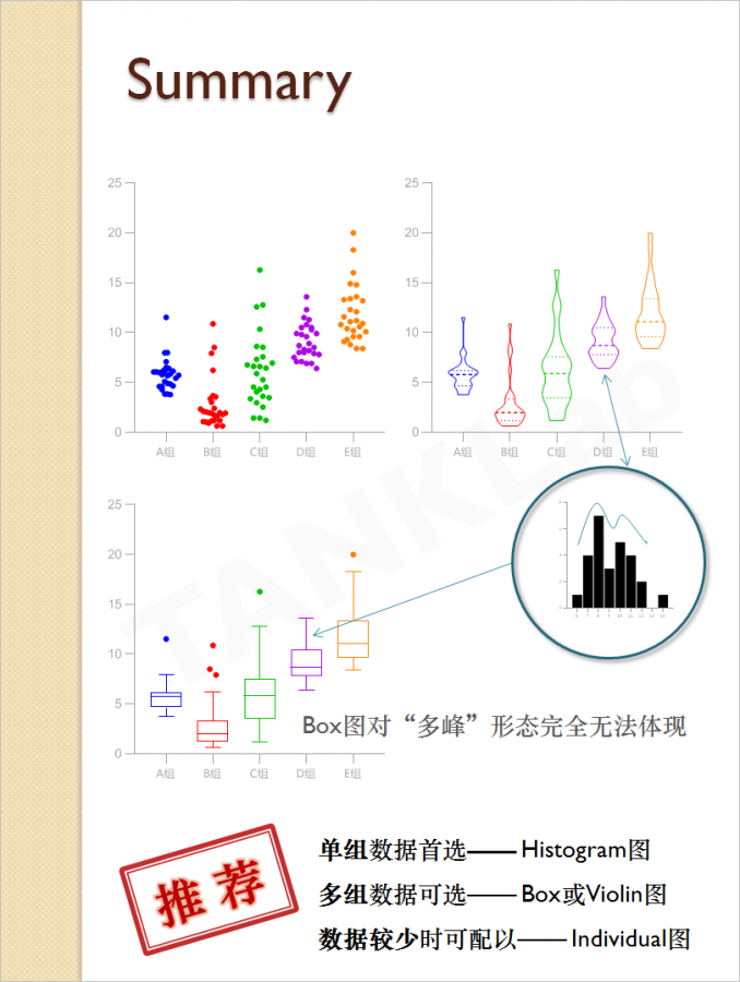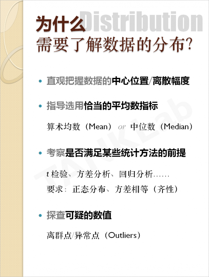 总之,图示数据的分布,可以帮助我们直观快速地捕捉纷杂数值中潜藏的重要特征,是选择恰当统计指标和统计分析方法的关键步骤,也是提升分析效果的有益手段(例如,剔除异常值就有可能极大改善分析结果)。