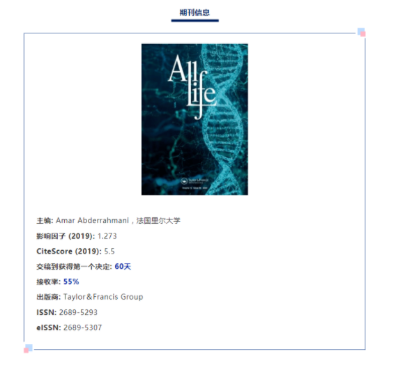 All Life 期刊服务于日益增长的生命科学领域相关的多学科和跨学科研究,总体来说,它是一本不错的期刊,有兴趣的朋友可以收藏多加关注。 |