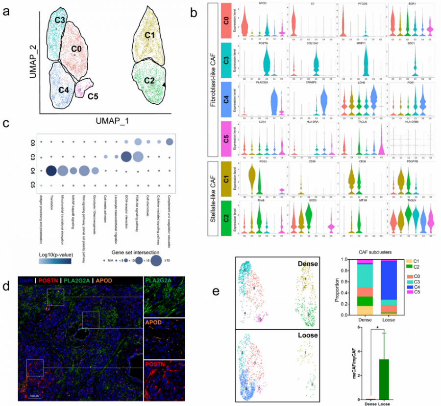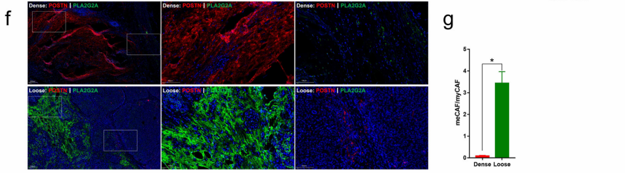 为了进一步确认 PDAC 中 meCAF、myCAF 和 iCAF 的存在,研究对进行 scRNA-seq 的九个 PDAC 样本的三种 CAF 亚群的标记基因进行了多重 IF 染色(C0 iCAF 为 APOD,橙色;C3 myCAF 为 POSTN,红色;C4 meCAF 为 PLA2G2A,绿色)。如图 2d 所示,在 PDAC 样品上观察到的重叠信号很少,表明 PDAC 的肿瘤微环境(TME)中存在三个不同的 CAF 亚群(图 2d)。胰腺星状细胞 (PSC) 被认为是 PDAC 中 CAF 的主要前体。值得注意的是,C4 亚群是松散型 PDAC 中的主要 CAF 种群,而 C3 是密集型 PDAC 中的主要亚群(P = 0.032)(图 2e)。为了进一步证实研究的发现,研究对所有进行scRNA-seq的九个样本进行了 IF 染色。来自密集型和松散型 PDAC 的代表性图像如图 2f 所示(图 2f)。 IF结果显示POSTN在致密型PDAC的基质中高表达,而PLA2G2A在松散型PDAC的基质中高表达,这与研究的scRNA-seq分析结果一致(P = 0.034)(图2g) )。