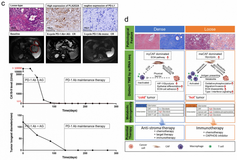 研究发现 CAFs、导管癌细胞和免疫细胞在极致密和松散类型的 PDAC(致密型:结缔组织增生程度高;松散型:结缔组织增生程度低)之间存在显着的肿瘤间异质性。值得注意的是,两者间未检测到 CAF 丰度的差异,但与密集型 PDAC 相比,在松散型 PDAC 中发现了一种具有高度活化代谢状态的新型 CAF 亚型 (meCAF)。 MeCAFs 具有高度活跃的糖酵解,而相应的癌细胞使用氧化磷酸化作为主要代谢模式而不是糖酵解。研究发现松散型 PDAC 中免疫细胞的比例和活性远高于密集型 PDAC。然后,在研究的 PDAC 队列和公共数据库中进一步验证了 CAF 亚型的临床意义。具有丰富 meCAFs 的 PDAC 患者具有较高的转移风险和较差的预后,但对免疫治疗的反应明显更好(客观反应率为 64.71%,1 例PR)。