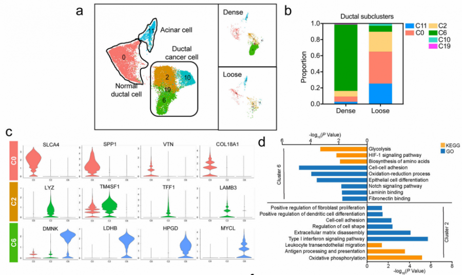 CAF 异质性受到来自不同肿瘤细胞的信号的空间调节。已有研究表明,肿瘤细胞内在的 TGFβ 和 IL-1/JAK/STAT3 信号传导是造成 myCAF 和 iCAF 形成的主要途径。为了阐明 meCAFs 的形成,研究发现了致密型和松散型 PDACs 之间导管癌细胞的瘤间异质性。在本研究中,导管癌细胞聚集成四个主要群体(C2、C6、C10、C19)(图 3a)。通过比较两种类型的 PDAC 肿瘤,研究发现 C6 亚群在密集型 PDAC 中占优势,而 C2 亚群在松散型 PDAC 中占优势(图 3b)。值得注意的是,C2 亚群表达经典Marker基因,如 TFF1、LYZ、TMASF1 和 LAMB3,而 C6 亚群表达基因,如 DMNK、LDHB、HPGD 和 MYLC。标记基因的 GO 和 KEGG 分析表明,导管癌细胞 C6 亚群中高表达的基因参与糖酵解、氨基酸的生物合成、HIF-1α 信号传导、ECM 结合和上皮细胞分化。相比之下,C2 亚群显示出富含氧化磷酸化、ECM 分解、I 型干扰素信号传导、抗原呈递和白细胞跨内皮迁移的基因(图 3c、d)。这些数据揭示了 C2 和 C6 亚簇的独特代谢特征,这可能与其在肿瘤中的不同位置和周围 TME 相关。