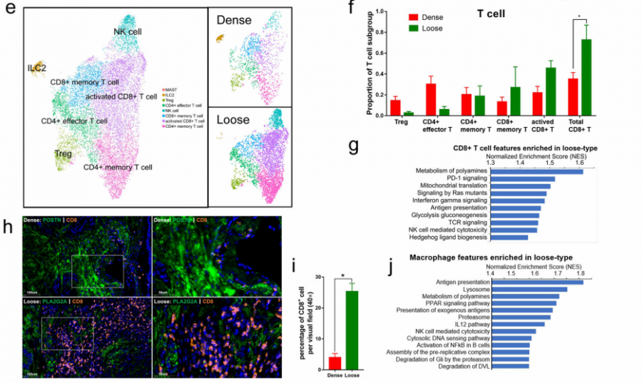 图3. 致密型和松散型 PDAC 中导管细胞和免疫细胞的不同特征