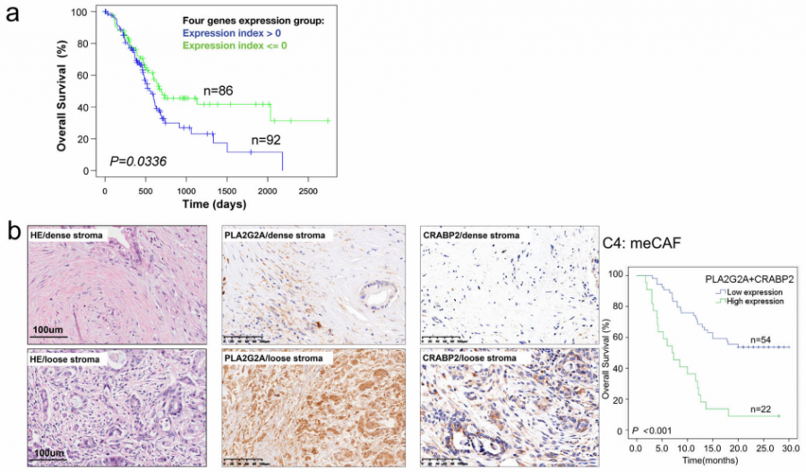 为了验证研究的假设,研究首先随访了被招募的 7 名进行 scRNA-seq 研究的患者(3 名松散型 PDAC 患者和 4 名密集型 PDAC 患者)。与研究的假设一致,所有三名松散型 PDAC 患者在手术后 6 个月内复发。此外,研究使用 TCGA 数据库分析了多个 CAF 亚组中标记基因与患者预后的关联。研究发现 meCAF 的组合标记基因表达系数与患者存活率呈负相关(图 4a)。此外,为了验证上述六个 CAF 亚组标记基因的表达,研究对每个亚簇(C4 meCAFs 为 PLA2G2A 和 CRABP2,C3 myCAFs 为 POSTN,C0 iCAFs 为 APOD,C1 为 RGS5,C2为 MYH11 )的PDAC患者队列(Renji 队列,n = 94)进行生存分析。生存分析结果表明,基质中 meCAF 标志物(PLA2G2A + CRABP2)的高表达与较差的总生存期有关(HR:3.900,95% CI:2.134-7.127)(图 4b)。并且与临床病理学特征的相关性分析表明,meCAFs 与患者的血管浸润呈正相关。然而,未发现其他四个 CAF 亚组与总生存期相关。这些数据进一步表明,meCAFs 可能与 PDAC 较高的转移潜力有关,从而影响患者的预后。