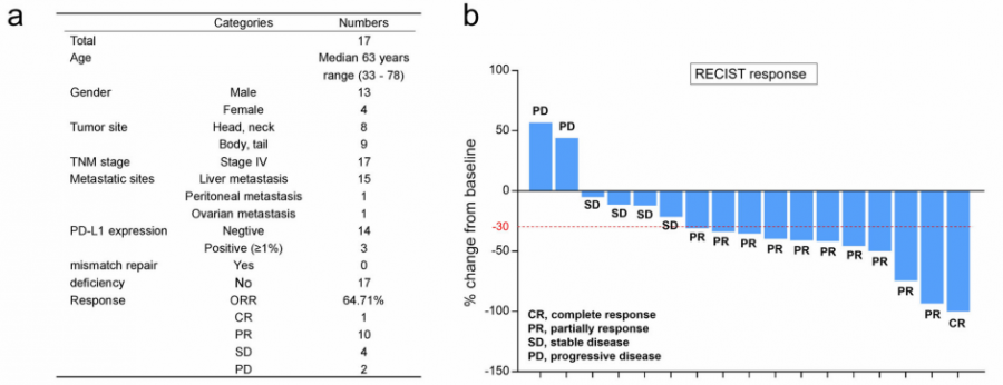 在临床实践中,经常遇到具有中度结缔组织增生的 PDAC,它具有致密和松散型 PDAC 基质的部分特征。很难将这些情况分为密集型或松散型 PDAC。因此,与结缔组织增生程度相比,meCAF信号可以被精确量化,并可能用于预测PDAC患者的预后及其对免疫治疗的反应。为了探索 meCAF 丰度是否会影响对免疫疗法的反应,又进行了一项初步研究,以观察患者对 PD-1 抗体的反应。通过使用经皮活检明确病理诊断为转移性 PDAC 的年龄≥18 岁的患者符合条件。接受过先前系统治疗(包括辅助治疗)的患者被排除在外。先用H&E染色区分肿瘤间质,然后用 IF 染色检测PLA2G2A的表达。选择了 17 名具有丰富 meCAFs(基质中高 PLA2G2A 表达)的 PDAC 患者,并评估了他们对 PD-1 抗体的反应。详细的临床信息如图 5a 所示。这些患者首先接受了6个周期的化疗(白蛋白结合型紫杉醇联合吉西他滨)联合PD-1抗体,然后单独接受PD-1抗体作为维持治疗。研究发现,在这 17 名患者中观察到了显着的反应(10 人部分缓解,1 人完全缓解,ORR:64.71%),远高于之前的报告(图 5b)。值得注意的是,获得 CR 的患者接受了 PD-1 抗体作为维持治疗(> 3 个月),评估结果仍为 CR(图 5c)。这些数据鼓励后期进行大规模的临床研究,以进一步验证发现的临床意义。