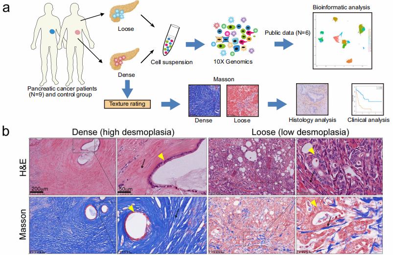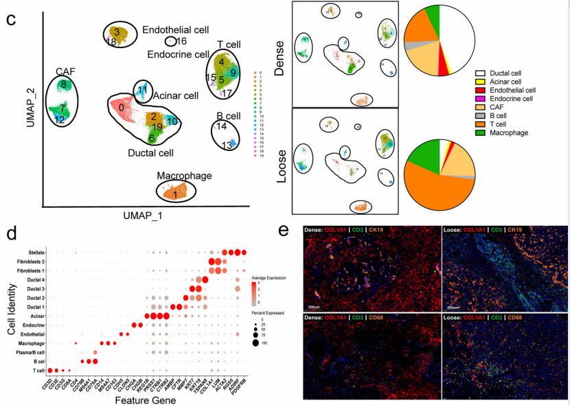 人类 PDAC 的标志是由 CAFs 引起的广泛的结缔组织增生。以前根据组织学特征对致密型和松散型 PDAC 进行分类,但没有分子生物标志物表明它们在预后和治疗选择方面的潜在差异。为了探索 PDAC 中不同质地的肿瘤间异质性,本研究首先根据肿瘤组织病理学(Haemo toxylin 和 Eosin;H&E 和 Masson 染色)将 PDAC 分为致密型和松散型。来自未经治疗的 PDAC 患者的九个肿瘤,包括四个致密型 PDAC、三个松散型 PDAC 、两个中型 PDAC(在致密型和松散型 PDAC 之间)以及一个相邻的正常样本,被酶消化成单细胞悬液,然后使用 10x Genomic 平台进行单细胞测序(图 1a,b)。