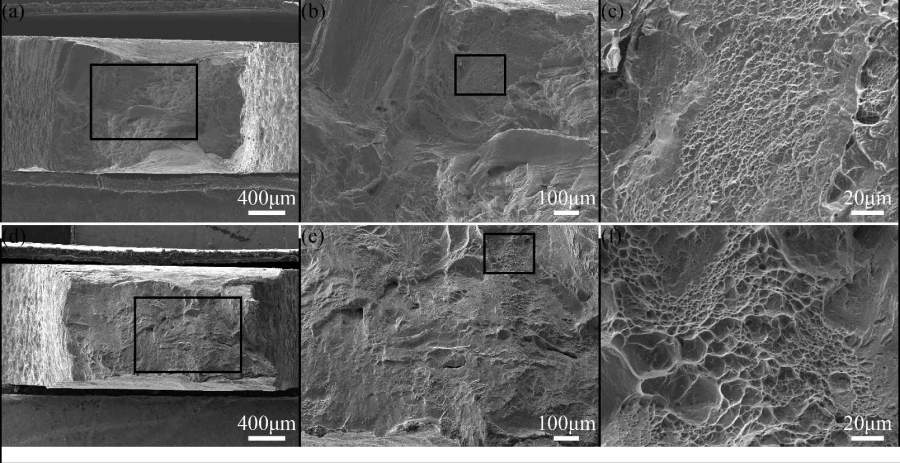 请问各位大佬,TC4合金500摄氏度拉伸断口如图,abc是一种工艺下的一个试样,def是另一种工艺, 1.请问这两种是不是都是既有脆性断裂又有韧性断裂?我观察得到都有韧窝,也有解离台阶,河流花样 (不知是否正确)? 2.实验结果得到def图试样的延伸率更大些,可否通过c和f图韧窝的大小和深浅来解释两种工艺下,材料延性的好坏? 发自小木虫Android客户端 |