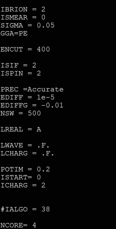 求助,结构优化不正常停止,报错Error EDDDAV: Call to ZHEGV failed. Returncode = 7 1 8,要怎么解决啊 以下是报错和我的INCAR设置 发自小木虫Android客户端 |