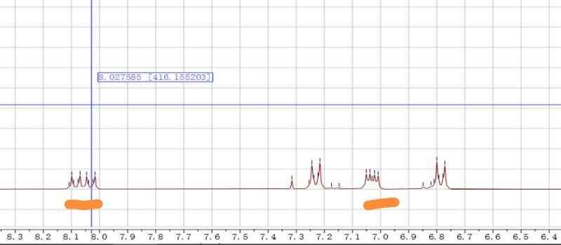 7.00-7.05之间猜测是双二重峰,但积分有2个氢;8.10-8.00的不像四重峰,倒像是四个小单峰,不知道怎么回事?请各位大佬帮帮忙看看! @wyy080214 @klicking @superyeast 发自小木虫Android客户端 |