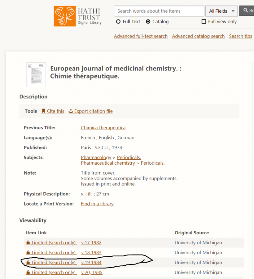 需要下载一篇Eur.J.Med.Chem的文献,在网上只搜到1987年之后的文章链接,需要下载的文献是1984年的,请教一下如何下载,多谢大家啦。 Eur.J.Med.Chem-Chem,Ther,1984-19,No.5,pages 441-450 多谢大家啦 ![]() |