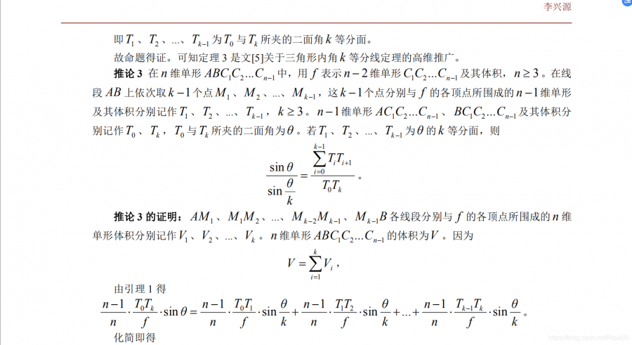 本文把三角形的等角线定理推广至n维单形,给出了单形二面角的等角共轭面、角平分面、k等分面的相关性质。