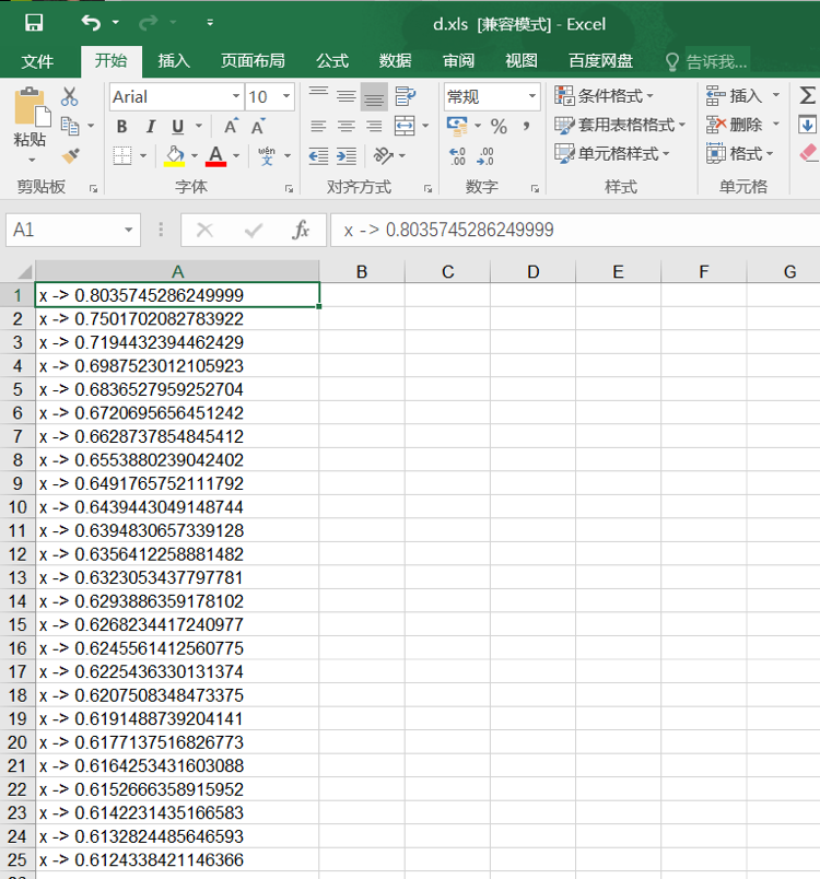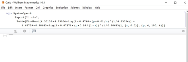 方程:4.35156*4.83054*Log[1 + 0.4748*(p*0.01/x)^(1/4.83054)] == 1.63739*0.90643*Log[1 + 0.87271*(p*0.99/(1 - x))^(1/0.90643) p的取值范围为0到100,我想得到的是取其中若干值求得对应的x值。 我尝试输入如下代码: SystemOpen@ Export["d.xls", Table[FindRoot[4.35156*4.83054*Log[1+0.4748*(p*0.01/x)^(1/4.83054)]==1.63739*0.90643*Log[1+0.87271*(p*0.99/(1-x))^(1/0.90643)], {x,0.5}], {p,4,100,4}]] 得到的效果见图片 我取p从0到100的25个均匀分布的数,得到了其对应的x值,xls文件在excel中可以正常显示。 我想改进一下,使xls文件中第一列第一行显示的p,后续的行是p的25个值;第二列第一行显示x,后续的行是对应左边p解出来的x值。 发自小木虫IOS客户端 |