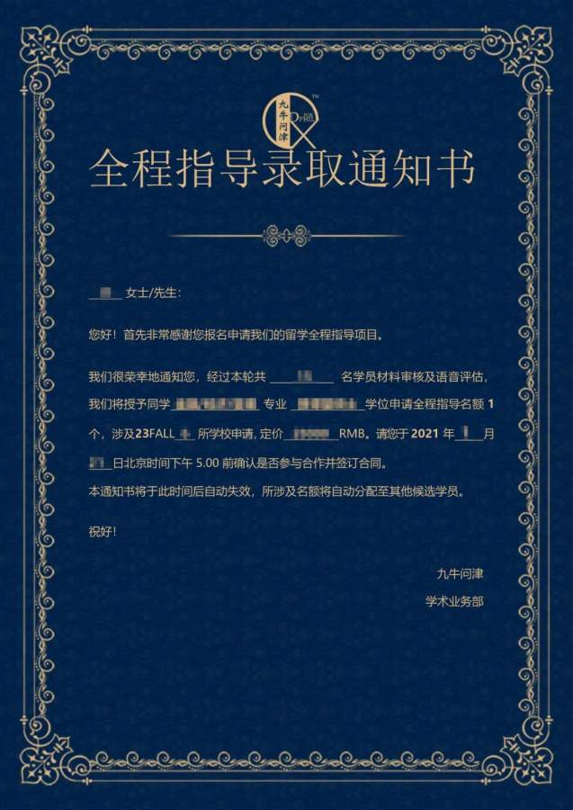 一、找到好的留学申请机构有多难? 简单无效定位、非本专业导师、申请材料错误百出、保录骗局、机械化流水化服务冷冰冰、导师申请量过渡饱和,留学申请行业存在的这些弊端使莘莘学子们在留学之路上倍感艰辛。 如何设计一款优秀的留学服务产品,真正解决留学申请中的痛点,是九牛团队的第一要务。 根据九牛创始人团队牛剑哈耶等名校的实际申请经历,分析同行竞品的优劣势之后,九牛团队研发出一套高效的“留学申请全程计划”服务。 五年多来,该“计划”帮助上百位学子成功申请到名校OFFER。 二、九牛的“留学申请全程计划” 是真牛还是吹牛? 1、屏幕背后敲键盘接受咨询都是硕博本人 为了确保提供高质量的专业服务,九牛在咨询阶段就配备了名校硕博亲自对接学员,做到了学历匹配、专业匹配以及依项目需求匹配。 名校硕博会根据学员的陈述给出专业对口的咨询建议,并根据不同学员的硬件条件量身定制服务项目。 2、锁定名额保证质量 一流师资充足分配 为保障学员竞争力,所有想要加入“留学申请全程计划”的学员,必须参加九牛博士团队的面试,整个面试流程长达30分钟。 面试将从学员基本情况、学业背景、申请硬件条件、整体未来规划等对申请学员作全方位评估。面试帮助学员厘清申请留学目的,软硬件条件及参与“全程计划”的必要性。只有条件符合的申请学员才能加入“留学申请全程计划”。 在面试通过后,将收到“留学申请全程计划”的正式OFFER,在向学术部提交学员相关资料后,即进入“签约合作”阶段。 “留学申请计划”每年各学科仅录取30名,这样就保证了参加“计划”的每一位学员都会得到充分的师资分配,避免出现导师精力有限,无暇顾及所有学员的情况。 3、全程跟踪服务覆盖学位申请全阶段 区别于DIY项目的“一次性服务”,“全程计划”着眼于对所有项目的长期跟踪、全程跟进、深度修缮及不断调整。 目标是让学员“满意为止”。在整个“申请”过程中,有许多难以预料的不确定因素,它们很可能将你原来的计划打乱,甚至影响最终的申请结果。 “全程计划”让你在申请的每一步都有专业硕博为你领航,即使偶尔偏离路线也能及时纠正,让申请过程事半功倍。 4、名校实名硕博保证学术实力 对于参与“计划”的学员,优先分配团队中最高级别、申请经验最丰富的硕博学士力量担任导师。(点击下方文字,了解详情) 学术阵容 | 英国及欧洲大陆硕士博士成员 学术阵容 | 亚洲地区硕士博士成员 学术阵容 | 美国及加拿大硕士博士成员 学术阵容 | 澳大利亚及新西兰硕士博士成员 借助强大的师资管理模式,在招聘、笔试、面试、培训、考核到月末淘汰制的各个环节,都强调高标准,极大提高了师资专业度、竞争力和输出质量。 5、“成功率保障”来自自信,自信来自专业 “留学申请全程计划”的历届学员均通过严格筛选参与计划,至今鲜有失败案例。 如遇极端情况失利九牛问津提供第二年免费申请。这与业界普遍的“退款措施”形成鲜明对比。 九牛认为“退款”并不解决问题,只有把学员成功送入理想“梦想”,九牛才有了成就感。 同时,“免费二申”的政策也倒逼服务团队尽全力帮助学员成功地一次通过,因为“二申”的成本全部由失败的服务团队承担。 也许这就是“留学申请全程计划”至今不败的原因吧。九牛的“成功率保障”是来自于成熟的服务设计及有效的售后政策。单纯这一点,就与同行拉开很大差距。 三、量身定制,灵活选择 --留学申请全程计划A/B方案崭新上线 为了满足每位学员的实际需求,九牛特将原有的“留学申请全程计划”设为A/B两种方案。 方案B在方案A的基础上进行了多项升级: 1、学术阵容提升为G5/港三/新二/藤校级别硕博士; 2、特别增加雅思/托福辅导服务,帮助学员更快提升语言能力; 3、针对申请“授课型硕士”项目的学员提供海内外企业实习机会; 4、针对申请“研究型硕士”及“博士”项目的学员提供“研究计划”制定辅导、辅助论文发表及非申请季早期学术套磁服务,有效增强学员学术背景。 对于想要“强补硬件”,在短时间内提升“硬件水平”的的学员来说,全程计划方案B将更适合需要“短期提升”的学员。 四、高质量 正三观 做清流 在九牛问津初创时,创始人周思就立下“高质量,正三观,做清流”的服务宗旨。 经过几年的实践,这样的服务宗旨已融入九牛服务的每一个环节,成为九牛问津的核心文化。 高质量即要保证服务流程中的每一个细节都要保证高品质,真正帮助学员顺利圆梦名校。 正三观即纠正学员某些存在偏差的认知观,申请留学的目的是什么?接受留学申请服务时,如何有效参与?申请成功后,如何规划今后的学习工作生活?九牛相信只有对留学抱有正确的认知观,才能使出国留学变得更有意义。做清流即在良莠不齐的留学服务市场树立标杆,促进整个行业良性发展。 |