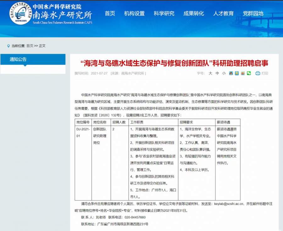 南海水产所招聘科研助理