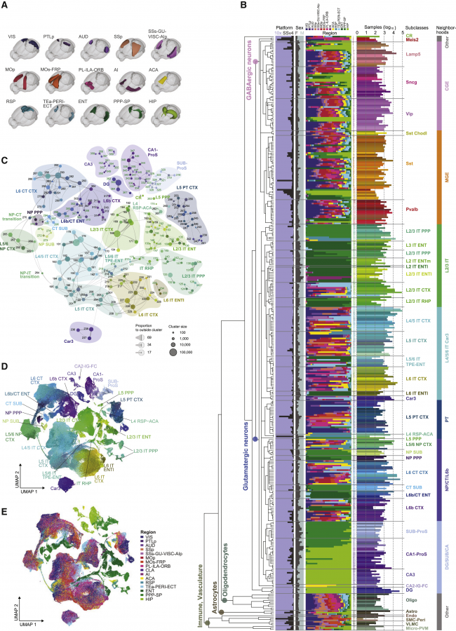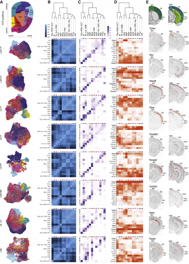 (A) 不同亚类中新皮层细胞的 UMAP 图。 顶部是等皮质区域的 2D 平面图表示,根据它们在 CCFv3 中的位置。