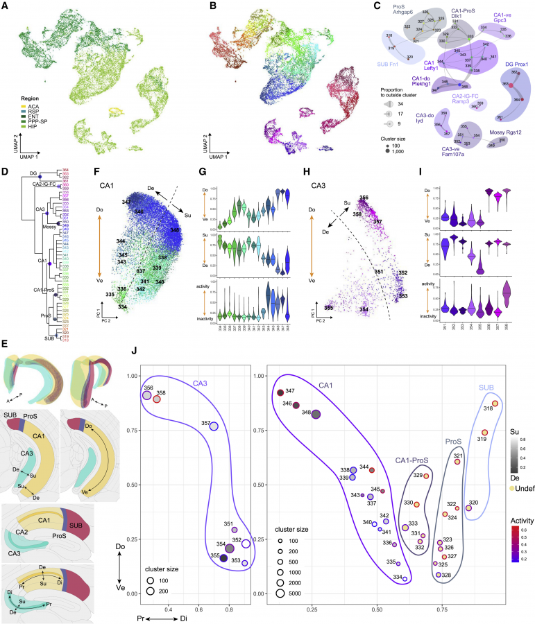 (J) Pr-Di、Do-Ve、Su-De 和 CA3、CA1、ProS 和 SUB 活性维度中细胞类型变异的总结。 每个圆圈代表一个集群,计算其单元成员沿四个维度中的每个维度的平均值。